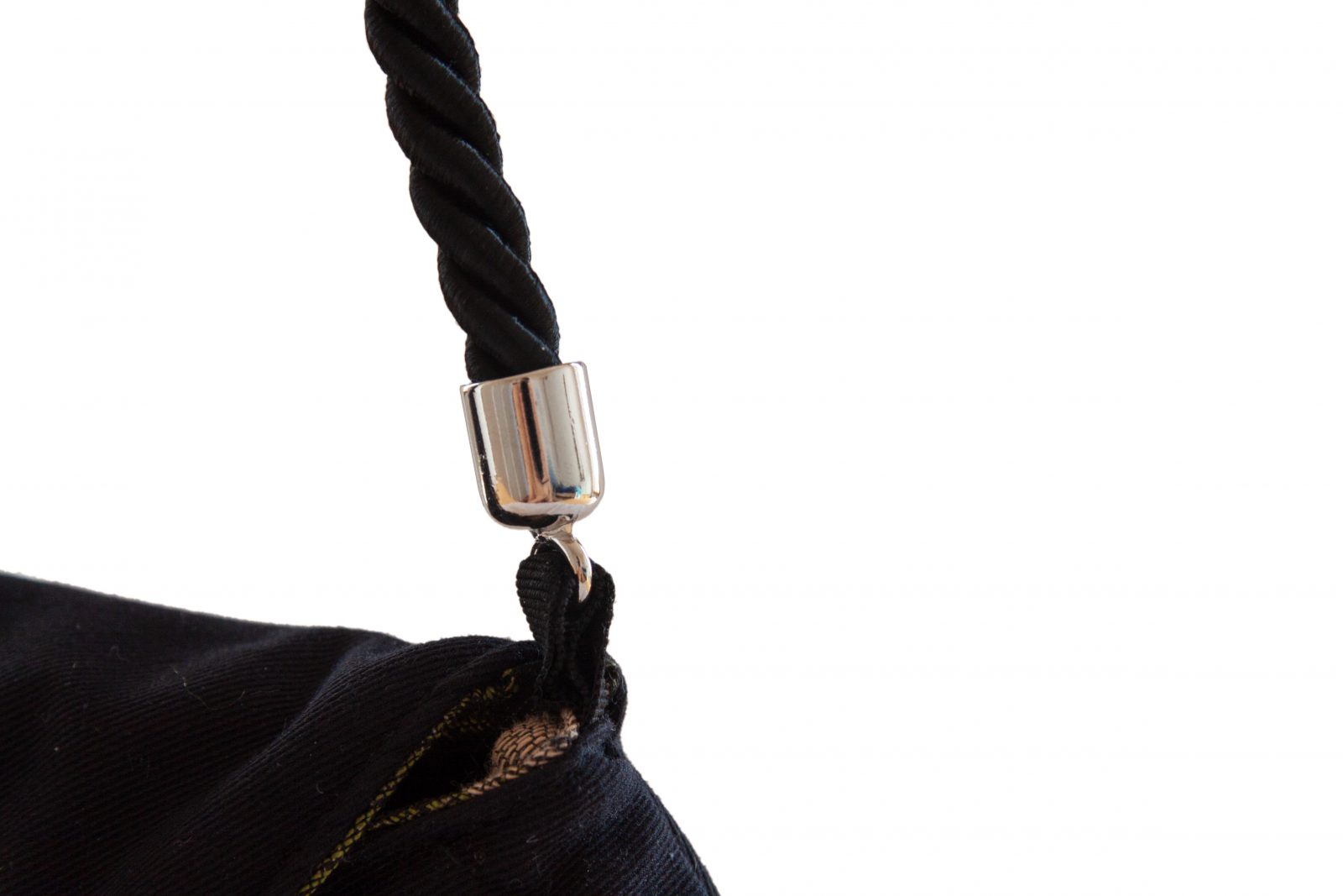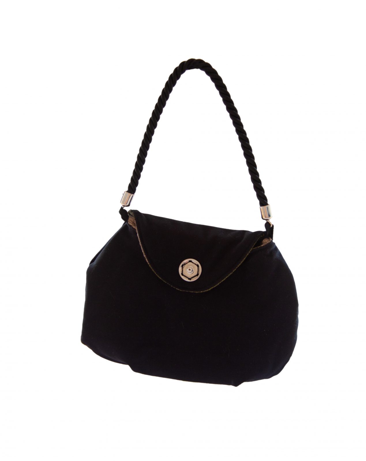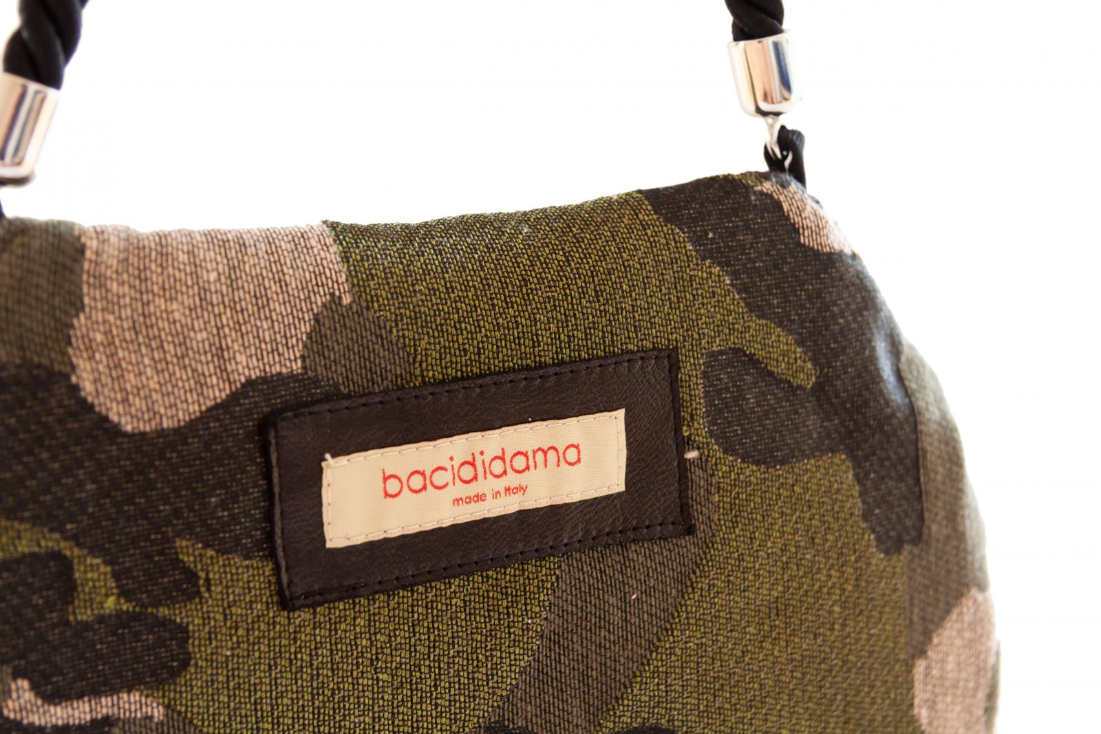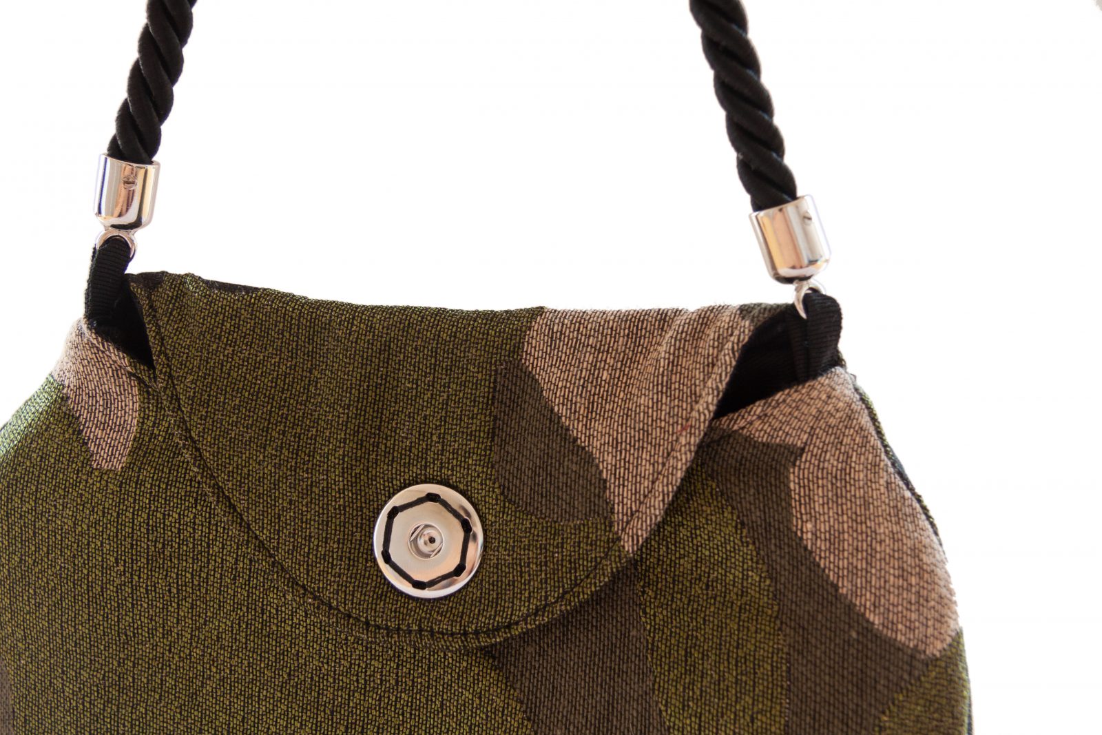Piccola borsa civettuola, da tenere a mano o sul braccio, ha la caratteristica di poter essere rovesciata ed indossata da ambo i lati. Questo modello è confezionato in tessuto di gabardine elasticizzato nero da un lato, mentre l’altro lato è in misto cotone camouflage nero e tonalità di verdi.