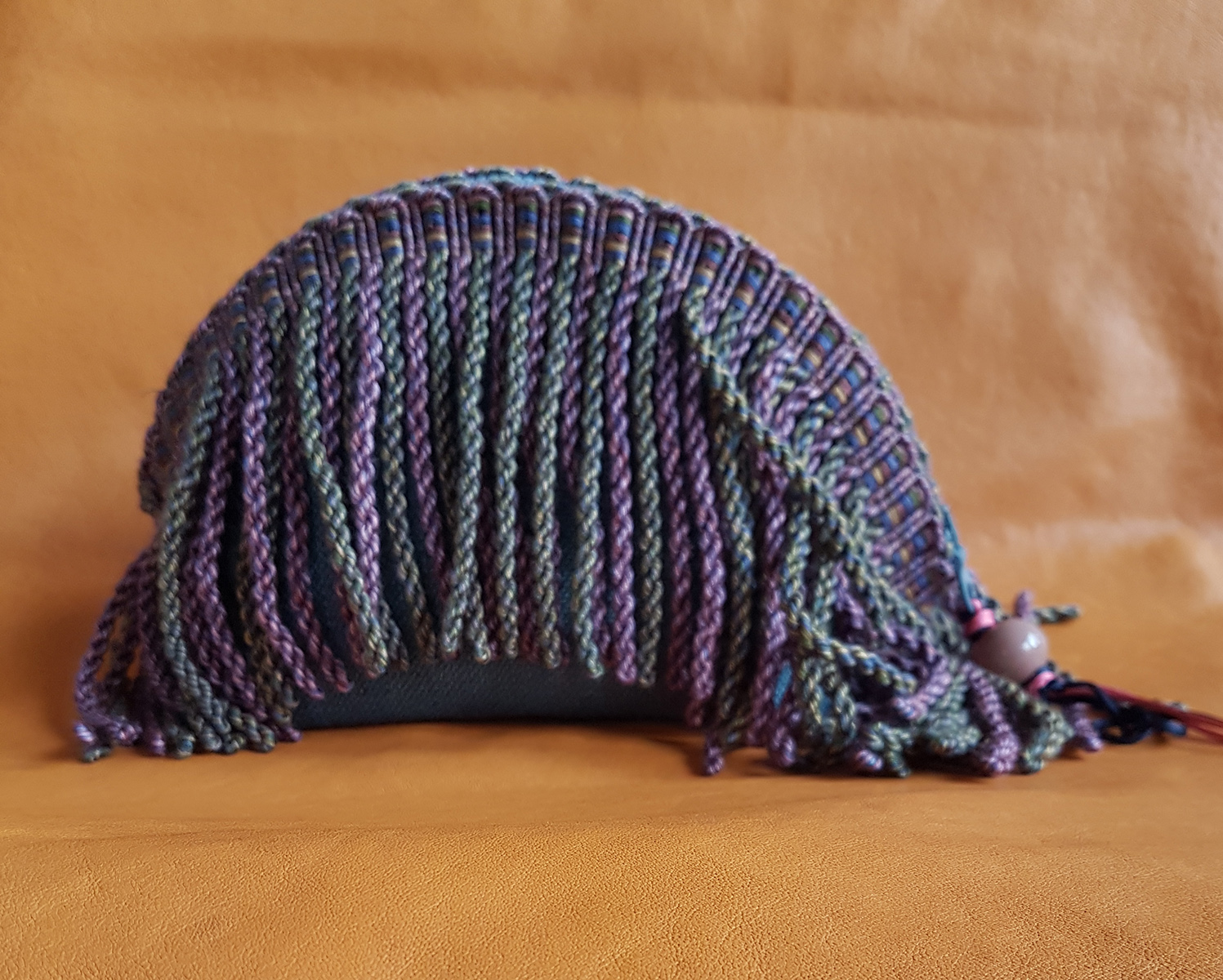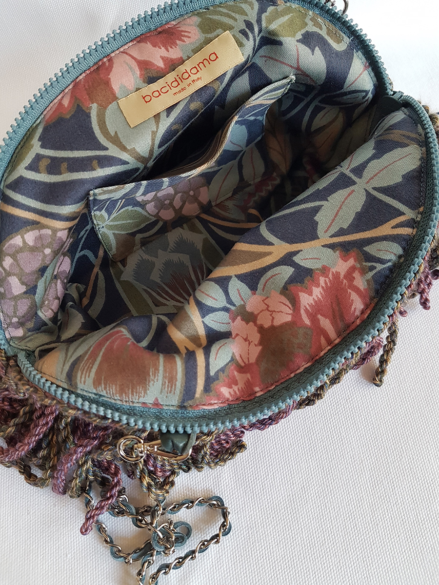 Buffa pouch a mano o con tracolla lunga removibile, rifinita internamente con tessuto in contrasto e decorata esternamente da passamaneria importante. Chiusura con cerniera impreziosita da perla in vetro tirata a lume.
